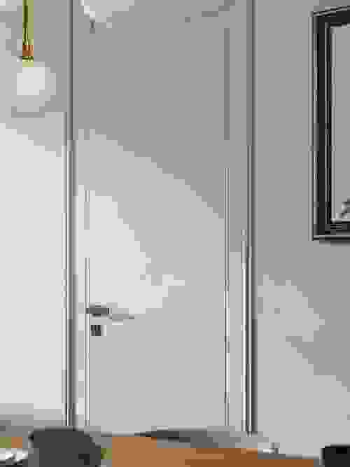 Скрытые двери высотой до трех метров — самое частое решение в современном интерьере. Такие полотна встраиваются в один уровень со стеной, без видимого короба и наличников.